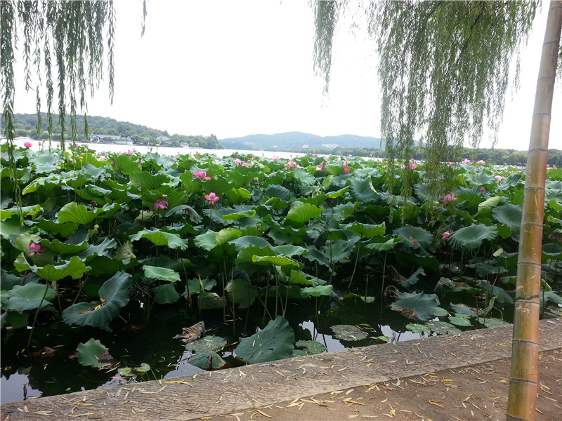 杭州西湖雨后湖面平静,清澈湖面显示绿草倒影图片